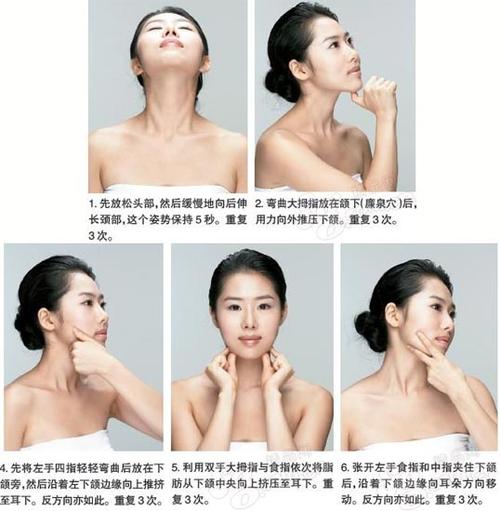 (3)按摩:通過(guò)按摩可以促進(jìn)面部血液循環(huán),加速脂肪燃燒,達(dá)到去除雙下巴的目的,按摩時(shí)可使用一些緊致肌膚的護(hù)膚品,提高效果。