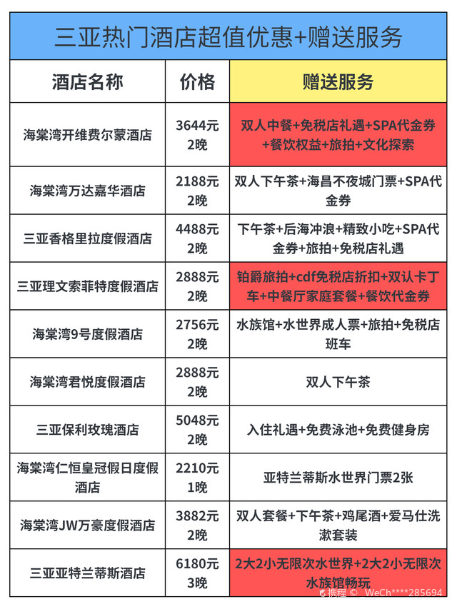 五星級房間:每晚800元至2500元人民幣不等,特色:熱帶花園、兒童俱樂部和豐富的水上活動,4. 三亞香格里拉度假酒店五星級房間:每晚1200元至3500元人民幣不等,特色:位于三亞灣,擁有私人海灘、豪華泳池和水療中心,5. 三亞亞龍灣鉑爾曼度假酒店五星級房間:每晚900元至3000元人民幣不等,特色:法式風(fēng)情度假酒店,提供多種餐飲選擇和水上樂園,6. 三亞亞龍灣熱帶天堂森林公園酒店五星級至七星級房間:每晚1500元至5000元人民幣不等特色:熱帶主題酒店,擁有叢林探險、玻璃棧道等獨(dú)特體驗(yàn),7. 三亞亞龍灣人間天堂-鳥巢度假村五星級至八星級房間:每晚2000元至萬元以上人民幣不等特色:獨(dú)特的鳥巢主題客房、懸崖餐廳和豐富的戶外探險活動,8. 三亞灣紅樹林酒店五星級房間:每晚18元至人民幣不等特色:大型綜合度假勝地,擁有購物中心、博物館等配套設(shè)施,價格根據(jù)房型和預(yù)訂時間有所變動,以上價格僅供參考,具體價格還需根據(jù)季節(jié)、預(yù)訂時間和房型進(jìn)行確認(rèn),在選擇酒店時,請根據(jù)您的需求和預(yù)算進(jìn)行篩選,除了價格因素外,還可以關(guān)注酒店的設(shè)施、服務(wù)以及客戶評價等方面,建議您在預(yù)訂前查看酒店的官方網(wǎng)站或相關(guān)旅游平臺以獲取最新信息和優(yōu)惠活動,在享受三亞的美麗風(fēng)光的同時,選擇合適的住宿將為您的旅程增添更多樂趣,無論是追求奢華體驗(yàn)還是經(jīng)濟(jì)型住宿的旅客都能找到適合自己的住宿選擇,希望這份三亞酒店價格表能夠幫助您規(guī)劃一次完美的熱帶度假旅行!在您的旅途中享受陽光沙灘、美食文化以及獨(dú)特的熱帶風(fēng)情吧!