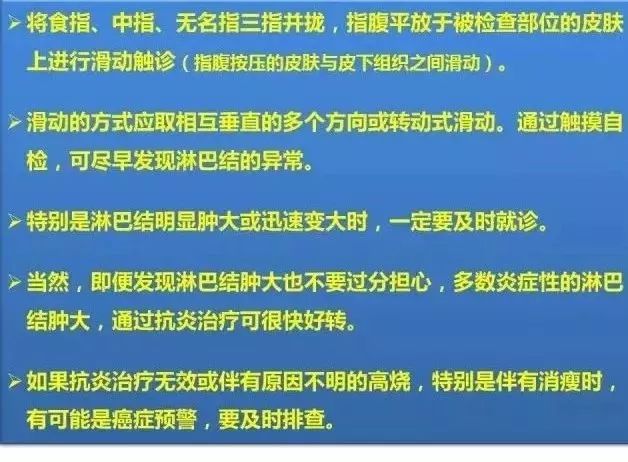 3、定期檢查:頸部淋巴結(jié)自檢不應(yīng)只在一次進(jìn)行,而應(yīng)該定期進(jìn)行,以便及時(shí)發(fā)現(xiàn)可能的變化。