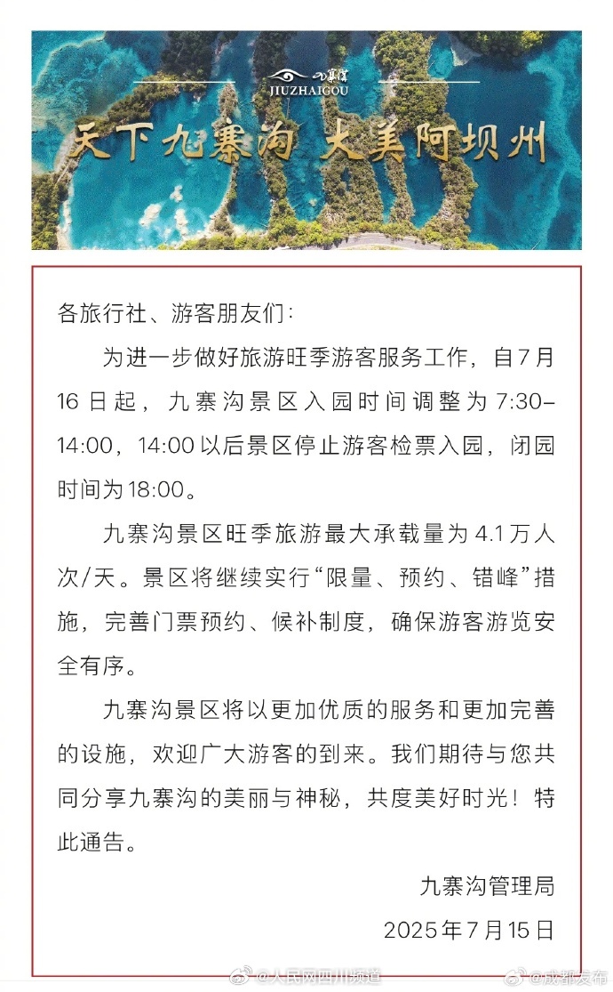 轉(zhuǎn)載請(qǐng)注明來(lái)自濰坊公路發(fā)展集團(tuán)有限公司,本文標(biāo)題:《九寨溝開(kāi)放時(shí)間最新消息,全面解讀最新開(kāi)放計(jì)劃,九寨溝最新開(kāi)放計(jì)劃全面解讀,開(kāi)放時(shí)間更新消息》