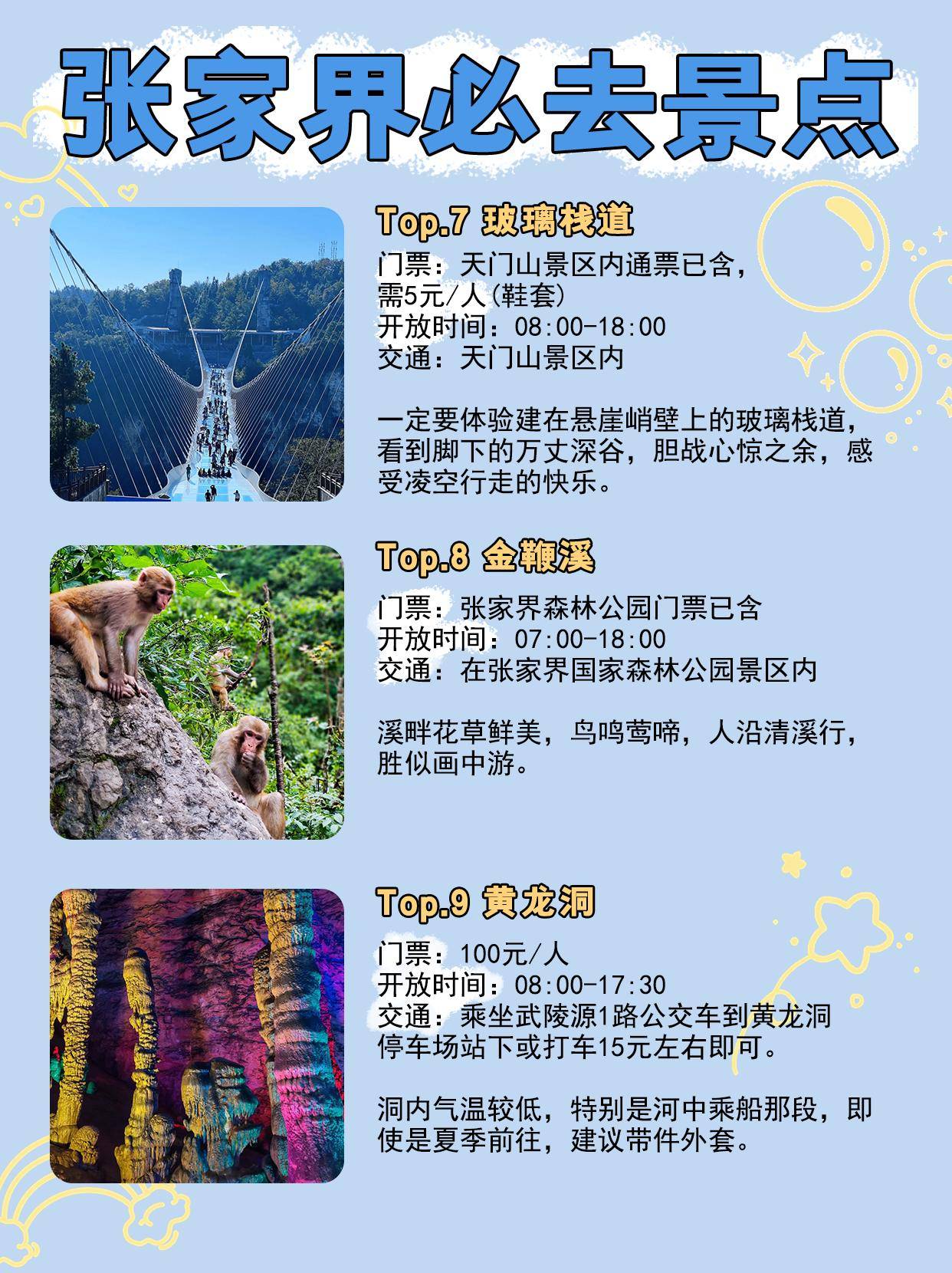 1、經典線路推薦:張家界國家森林公園是必游之地,可以欣賞到奇特的石峰、清澈的溪流和茂密的森林,黃龍洞、天門山等景點也是值得一游的。